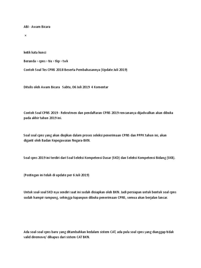 Tema soal dalam tes karakteristik pribadi (tkp) cpns 2019 yaitu . Tetap melanjutkan perjalanan untuk tepat waktu mengikuti tes pekerjaan. Tkp atau tes karakteristik pribadi pada seleksi penerimaan cpns 2019 ini akan mengadopsi soal hots atau high order thingking skills. Berikut ini contoh soal tkp anti radikalisme cpns 2021 beserta kunci jawabannya: Mahkamah agung (ma) membatalkan surat keputusan bersama .